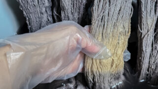 機上げスタート 2023.05.12 例年人気頂いている、化繊×カシミアの機上げスタートしましたまずは巻き取りから開始。(織りながら、巻き取った部分から縦糸を出していく仕組み)15mは大変でした(笑) いつもは平織りで作ってたのを、今回は総柄でやろうと思ってます。写真2枚目の柄になる予定です!※色はサンプルなので実際の出来上がりとは違います なんとか1日で巻き取り作業は終わり明日は綜絖(そうこう)→筬(おさ)と通して織る手前まで行ければ合格点にしたいね(*´ω`*)さて作業はどこまで順調に進むでしょうか 共有:シェア クリックして Mastodon で共有 (新しいウィンドウで開きます) Mastodon クリックして Misskye で共有 (新しいウィンドウで開きます) Misskye Tumblr で共有Tweet クリックして印刷 (新しいウィンドウで開きます) 印刷 クリックして WhatsApp で共有 (新しいウィンドウで開きます) WhatsApp クリックして Reddit で共有 (新しいウィンドウで開きます) Reddit いいね:いいね 読み込み中…