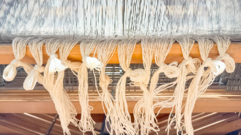 ◆製作中 スイカの準備 足跡ミニマフラー用のピンク地のウールを6本織り終わったのは先週土曜日日曜は定休日でお休み今日月曜からはスイカマフラーがスタートです 1)巻取り作業和名だと「千切り(ちきり)」洋名だと「ビーム」と言う、織る人の対面側にある糸を巻き取る部分に今後織っていく縦糸を機草(はたくさ)と呼ばれる厚紙的な紙を挟み込みながら巻き取る作業ここに巻いた糸を織りながら出して進めていく 2)綜絖(そうこう)通し織機の規模... 2026.04.27 ◆製作中◇進捗ウールコットンマフラー化繊麻