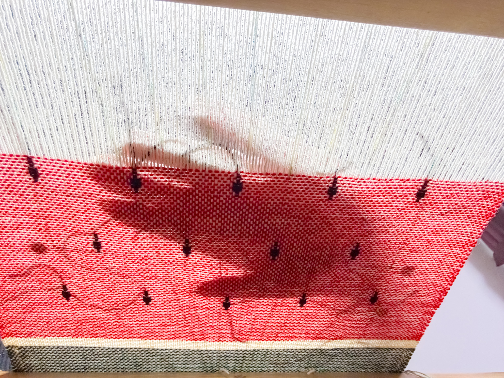 種を植える 2026.04.29 スイカの種植え始めました! 今期のスイカの種はいつもより横列の数を減らし 5-4-5粒ずつになりました 以前の1粒ずつ多いのも良かったけど 少しゆったり気味の26Verも悪くないかなって 1粒1粒織りながら植えていってます ここが一番手間がかかる部分なので 種ゾーンが終わるとサクサク織っていけます また織り進めて行って、反対側の端にも 種を植えたら1本目終わり そんな感じの6本が始まった所です #天仙工藝 #機織り #スイカマフラー #weaving 共有:シェア Mastodon で共有 (新しいウィンドウで開きます) Mastodon Misskye で共有 (新しいウィンドウで開きます) Misskye Tumblr で共有Tweet 印刷 (新しいウィンドウで開きます) 印刷 WhatsApp で共有 (新しいウィンドウで開きます) WhatsApp Reddit で共有 (新しいウィンドウで開きます) Reddit いいね:いいね 読み込み中…
